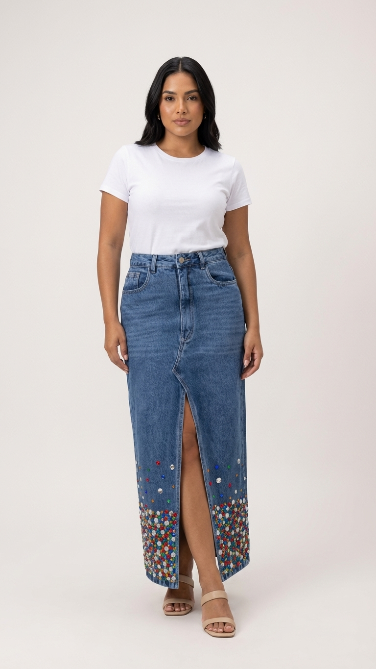 Saia mídi, com modelagem reta feita em Jeans de alta qualidade, com abertura frontal, bordado feito à mão em pedraria na barra. Bolsos laterais e traseiros. Fecho com ziper e botão metálico.